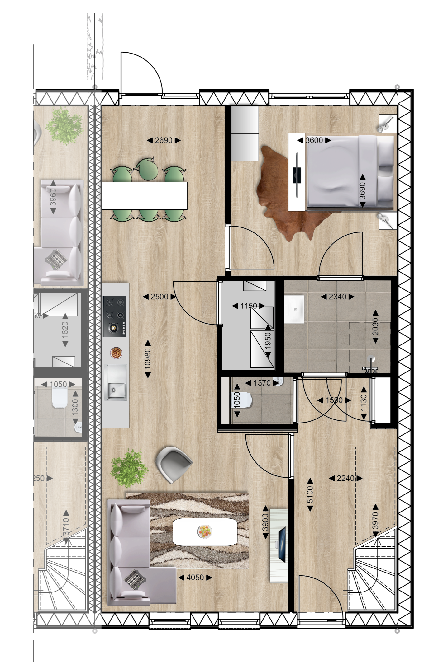 Binnenkomst via hal met toilet, meterkast en vaste trap naar de verdieping. Vanuit de hal betreed je de woonkamer met in het middenstuk de mogelijkheid voor de keuken. Kies je voor een slaapkamer op de begane grond dat is de meest logische indeling om de zithoek aan de voorzijde te plaatsen. Aan de achterzijde is dan ruimte voor een eetkamer. Een deur geeft toegang een de slaapkamer die aan de achterzijde van de woning gelegen is. Zowel vanuit de woonkamer als vanuit de slaapkamer heb je rechtstreekse toegang tot de achtertuin.