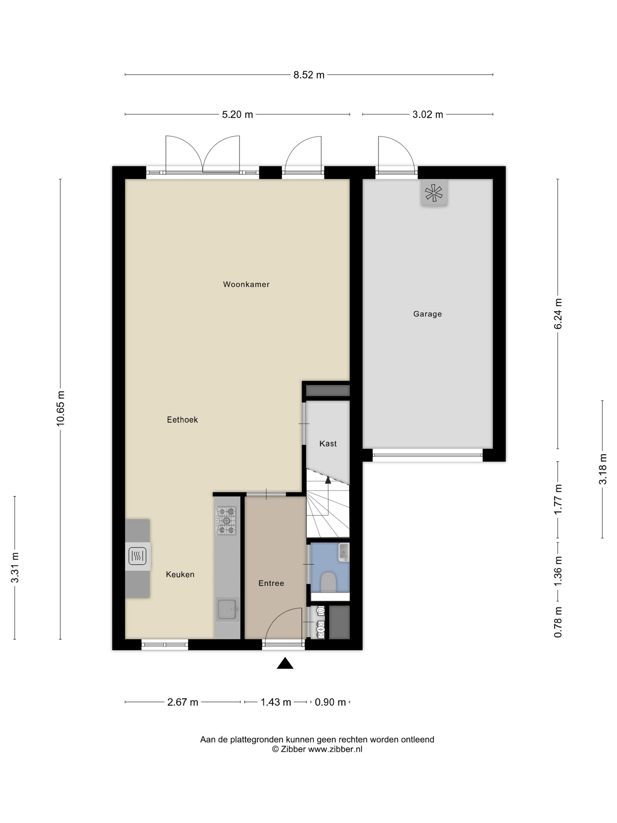 Binnen in de hal bevinden zich de meterkast, toilet, trap naar de eerste verdieping en toegang tot het woongedeelte.