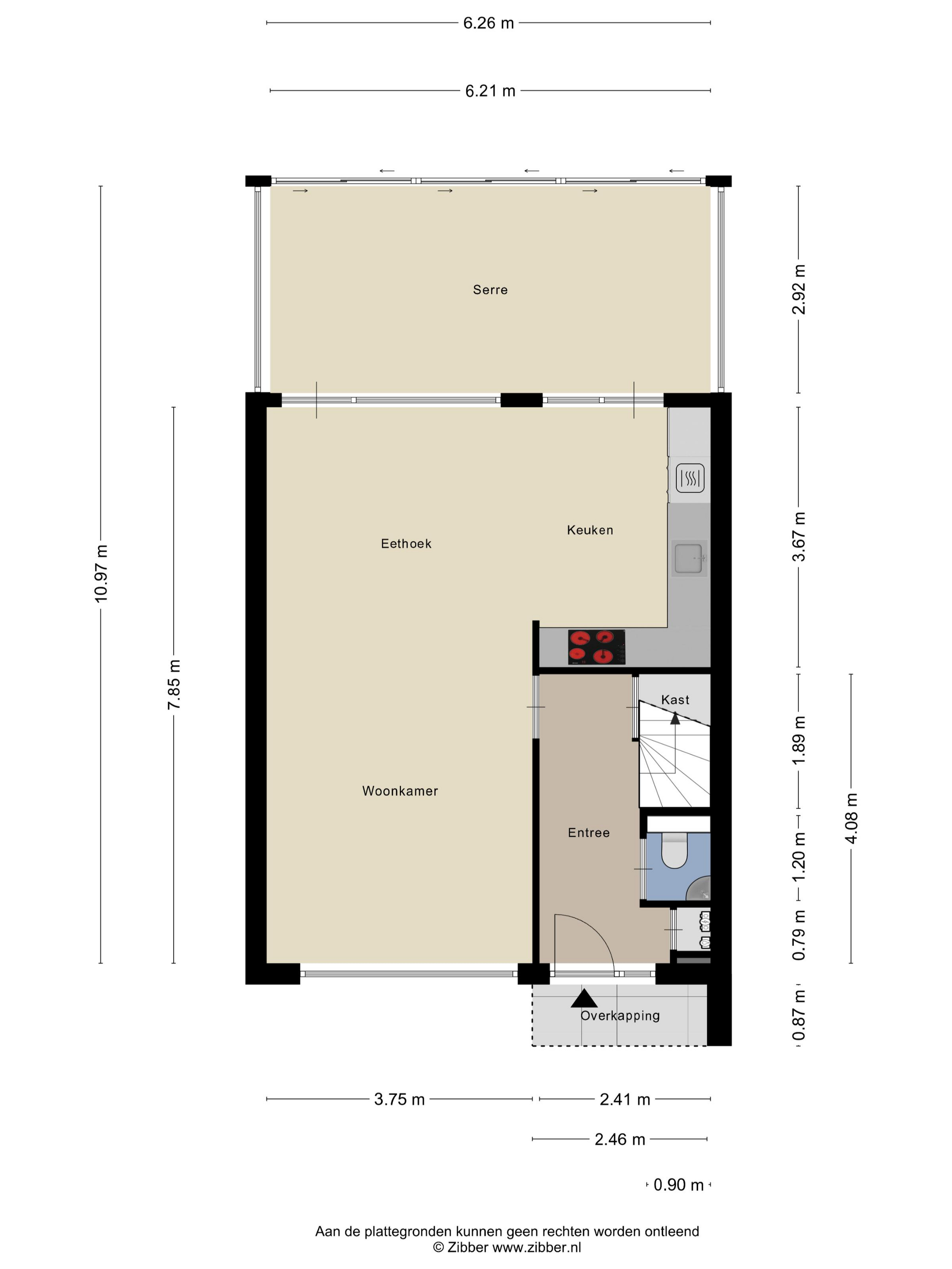 De mooie PVC-vloer in de hal is doorgelegd in de woonkamer en de keuken.