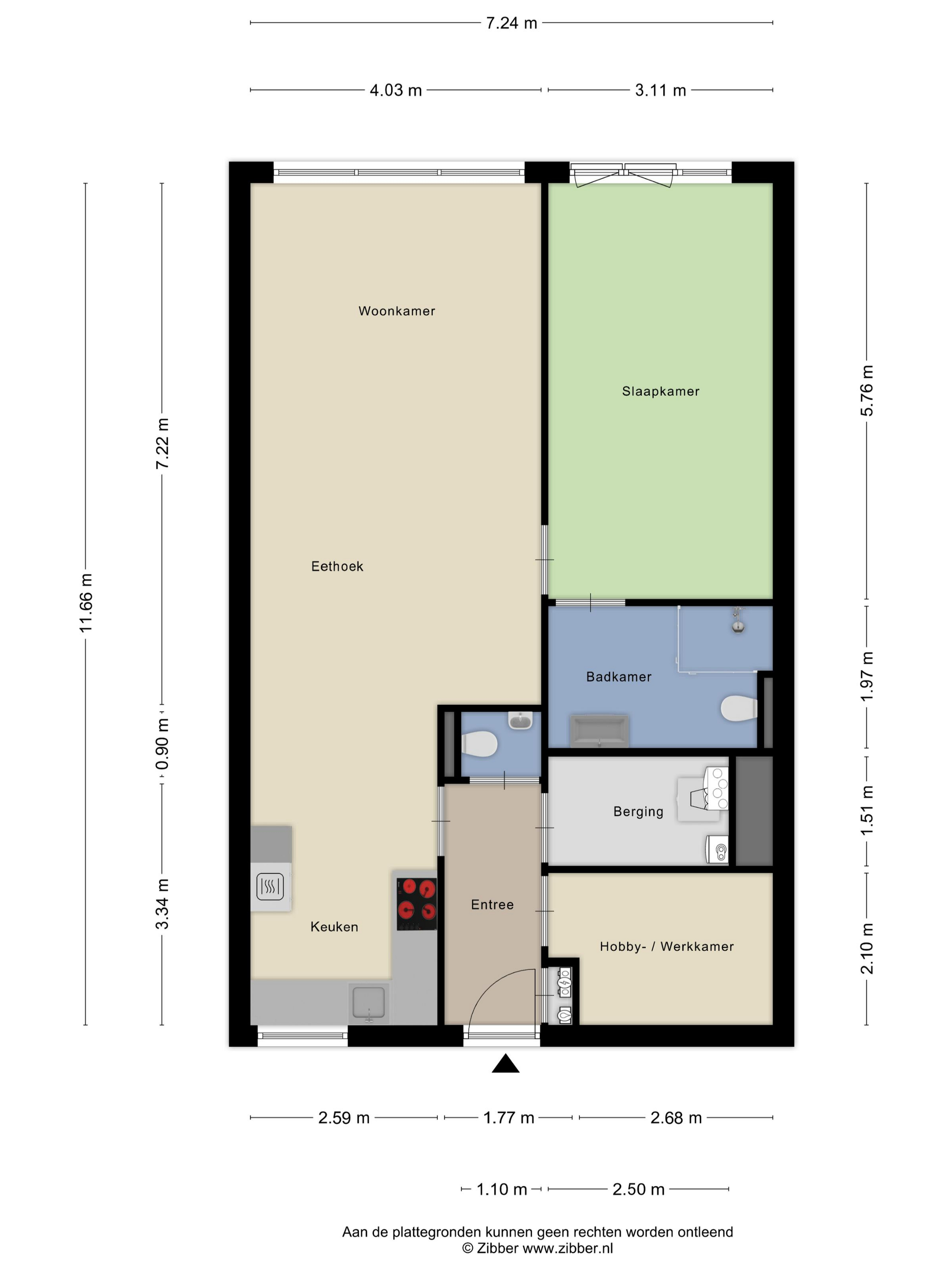 Entree via de hal met hangtoilet en fonteintje, meterkast en toegang tot de hobby-, werk en/of kledingkamer, berging met witgoed aansluitingen, HR-combiketel en WTW-unit, en woonkamer met halfopen keuken.