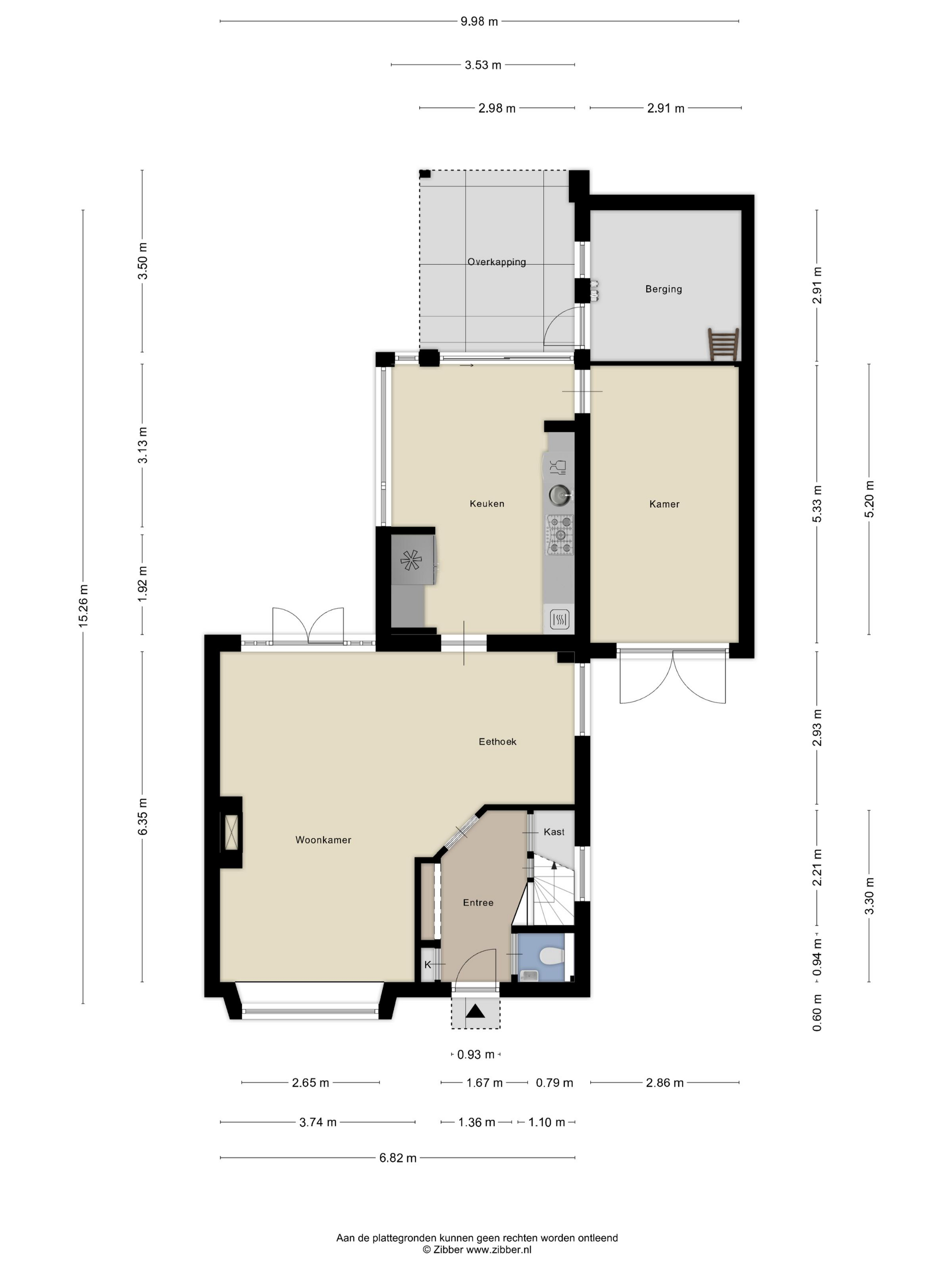 Bij binnenkomst in de hal is er toegang tot het toilet, de trapopgang en de woonkamer. De woonkamer is ruim en heerlijk licht dankzij de grote raampartijen en vormt een prettige leefruimte voor het hele gezin. Aansluitend bevindt zich de moderne keuken, die is voorzien van een gasfornuis, vaatwasser, combi oven/magnetron en koelkast. Via de schuifpui loopt de keuken naadloos over in buitenleven onder de overkapping. Vanuit de keuken is ook een extra kamer bereikbaar, perfect te gebruiken als thuiswerkplek, hobbyruimte of logeerkamer.