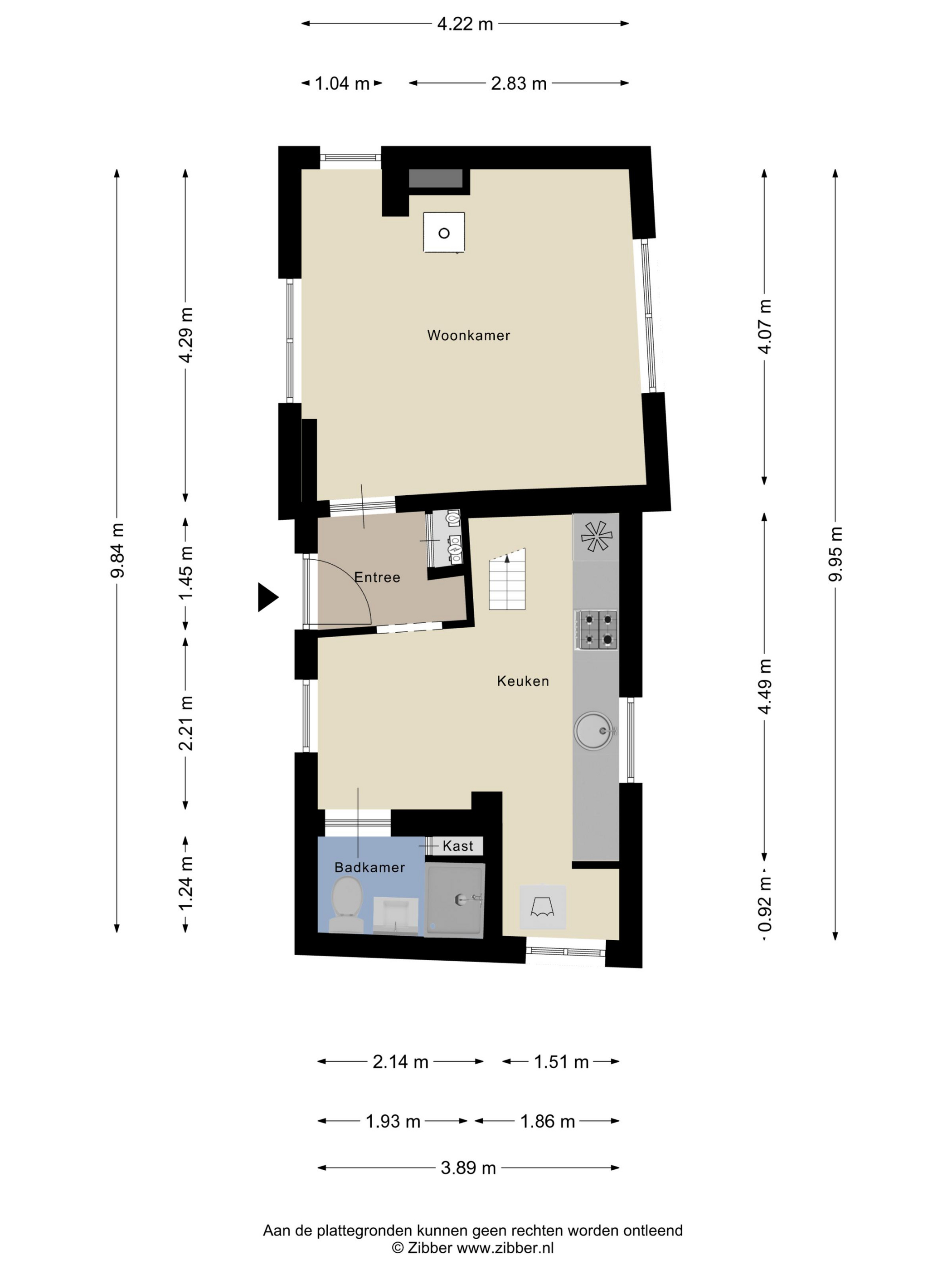 Aan de andere kant van de hal kom je in de keuken. Ook hier heb je weer dat mooie, vrije uitzicht terwijl je staat te koken. De keuken is praktisch ingericht met een 4-pits gasfornuis en een koelkast. Je vindt hier ook de aansluiting voor de wasmachine. Vanuit de keuken loop je door naar de badkamer, die is voorzien van een toilet, een wastafel met meubel en een douche.