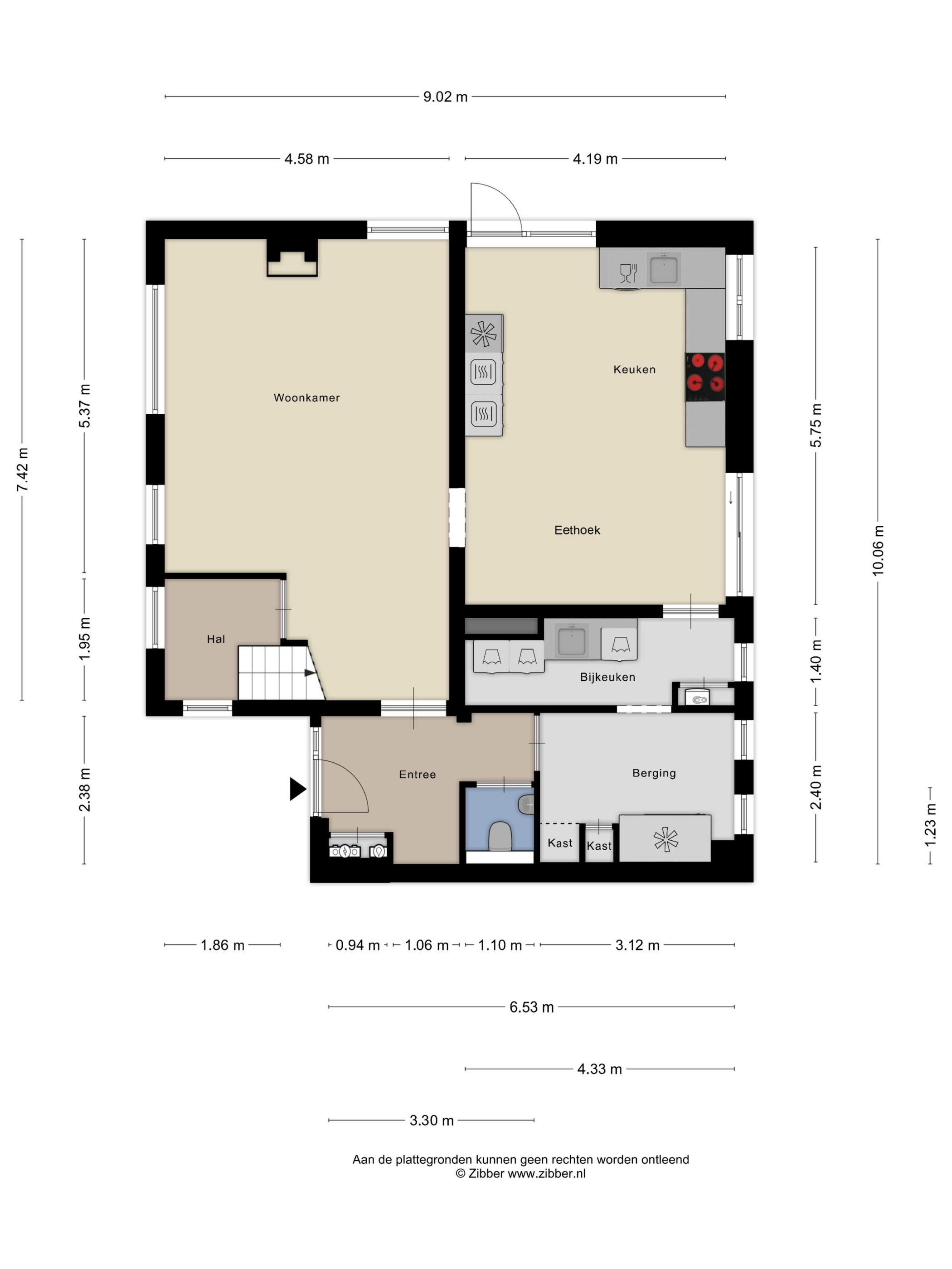 Aansluitend bevindt zich de strak afgewerkte bijkeuken, waar de cv-ketel en de aansluitingen voor de wasmachine en droger te vinden zijn. Daarnaast is er volop plaats voor extra opslag. In de woonkamer vind je een deur naar een kleine hal met de trap naar de eerste verdieping.