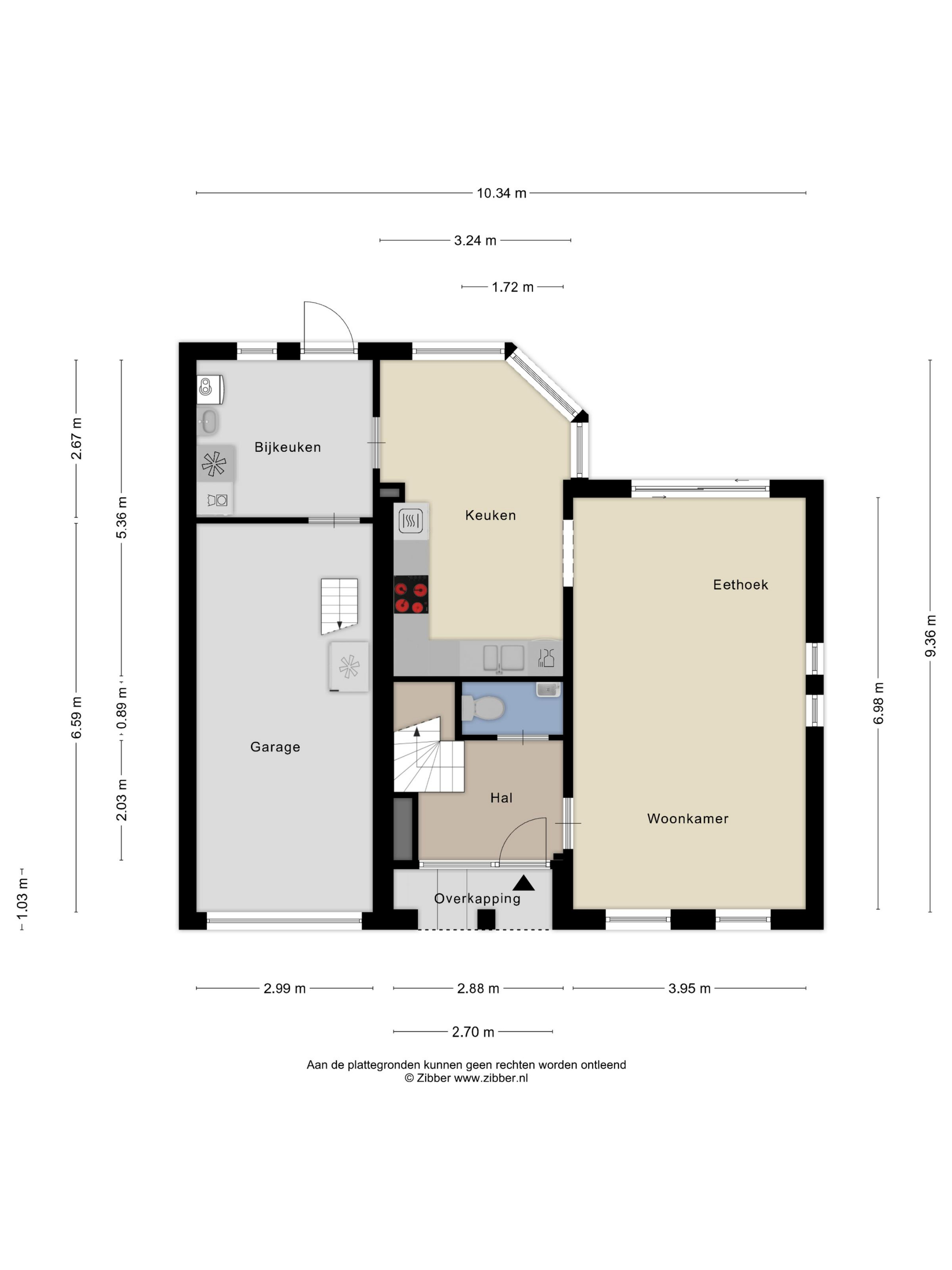 Overdekte entree de hal met meterkast en toilet met fonteintje. Vanuit de hal is de woonkamer en de trap naar de verdiepingen bereikbaar.