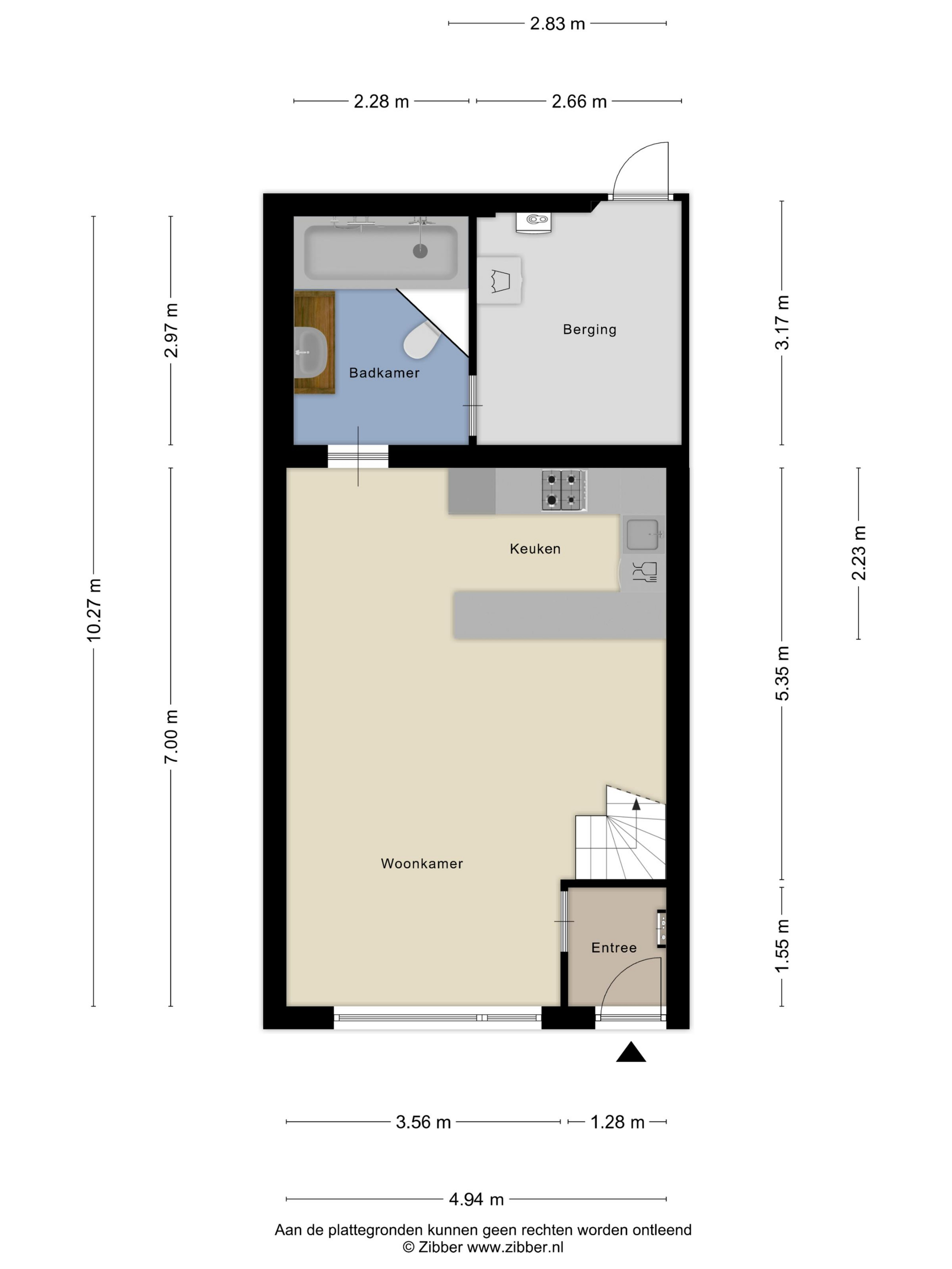 Entree met meterkast en toegang tot de woonkamer met open keuken en trap naar de verdieping.
