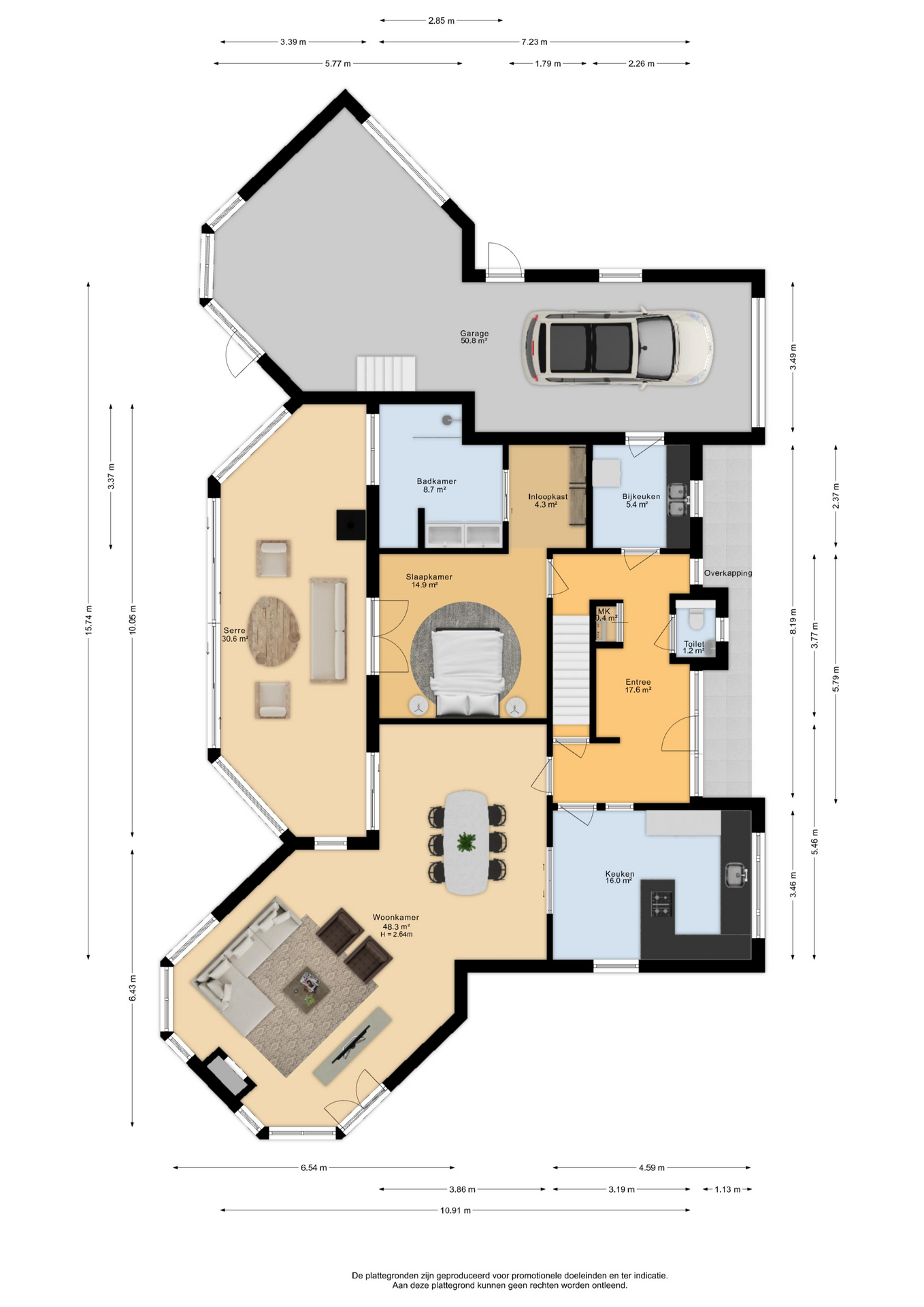 Deze indeling maakt de woning levensloopbestendig. De praktische bijkeuken biedt extra bergruimte en aansluitingen voor witgoed, en geeft toegang tot de ruime garage met twee sectional-deuren en